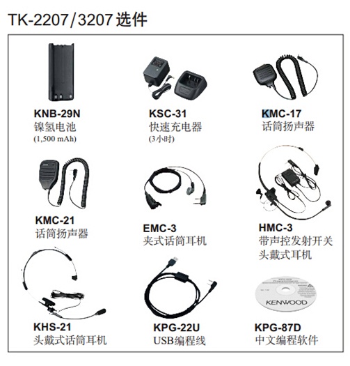 建伍对讲机TK-2207/3207指标及质量新突破----建伍超小型TK-2207/3207手持对讲机,又是一款被认同而具有优美人体工程学流线外型的设计。当拿起它时你会立刻赞赏它是多么容易使用,性能强劲:备有优先扫描、VOX和语音整 理等功能,它在任何工作环境均能可靠工作,符合美国军标MIL-STD 810及欧洲标准IP54/55防雨水测试标准。无论在户内或户外,雨天 或晴天,新型TK-2207/3207均有星级表现!